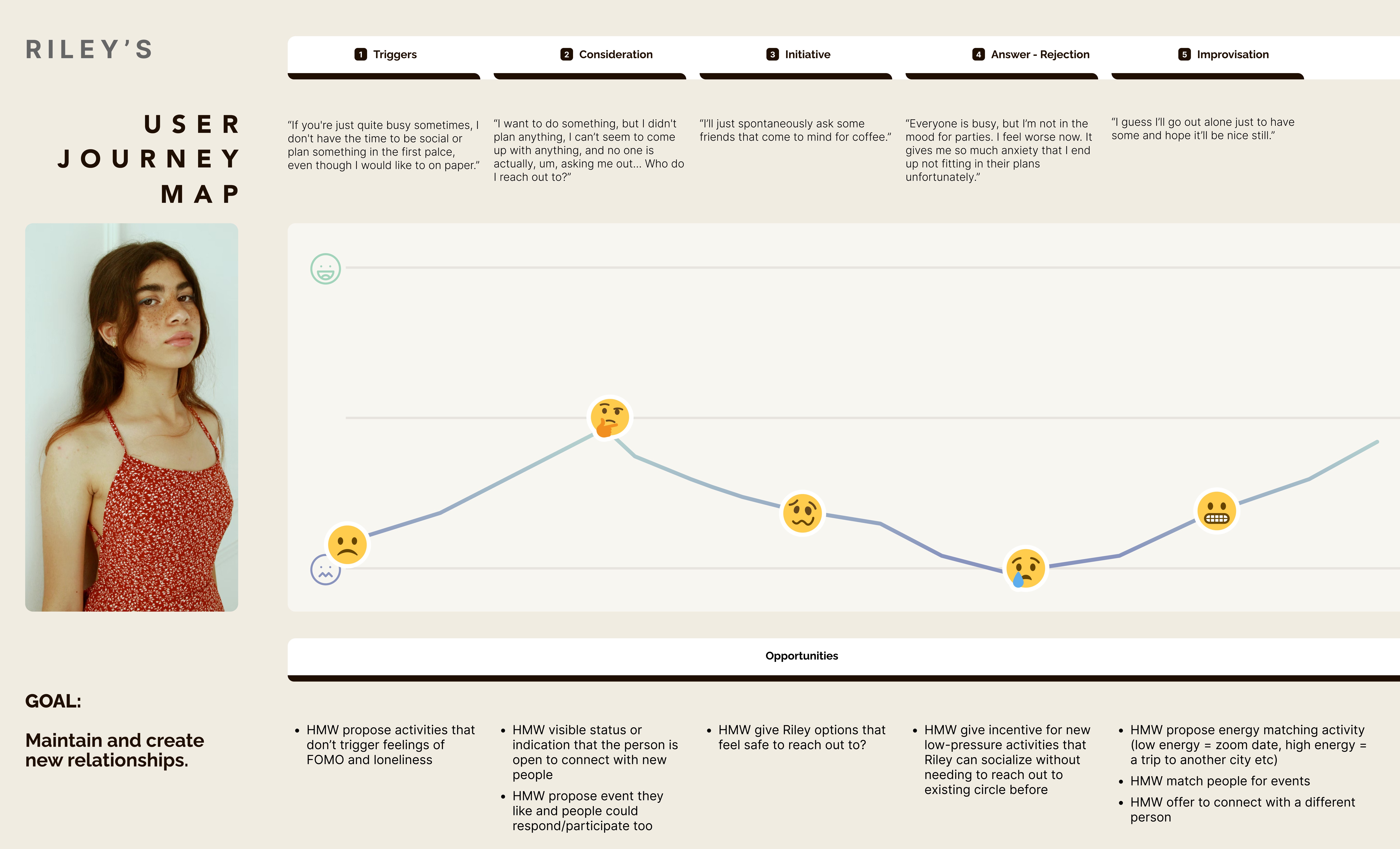 Main pain points: Anxiety makes it hard to initiate or sustain contact. Digital chats rarely turn into real‑life plans. Overstimulating, high‑energy events feel draining. Plans scatter across different apps and get forgotten. Main needs: Energy‑matched gatherings (low / medium / high). Boundaries‑first onboarding and tone. Effortless, personal event creation. Calm, feed‑free interface.