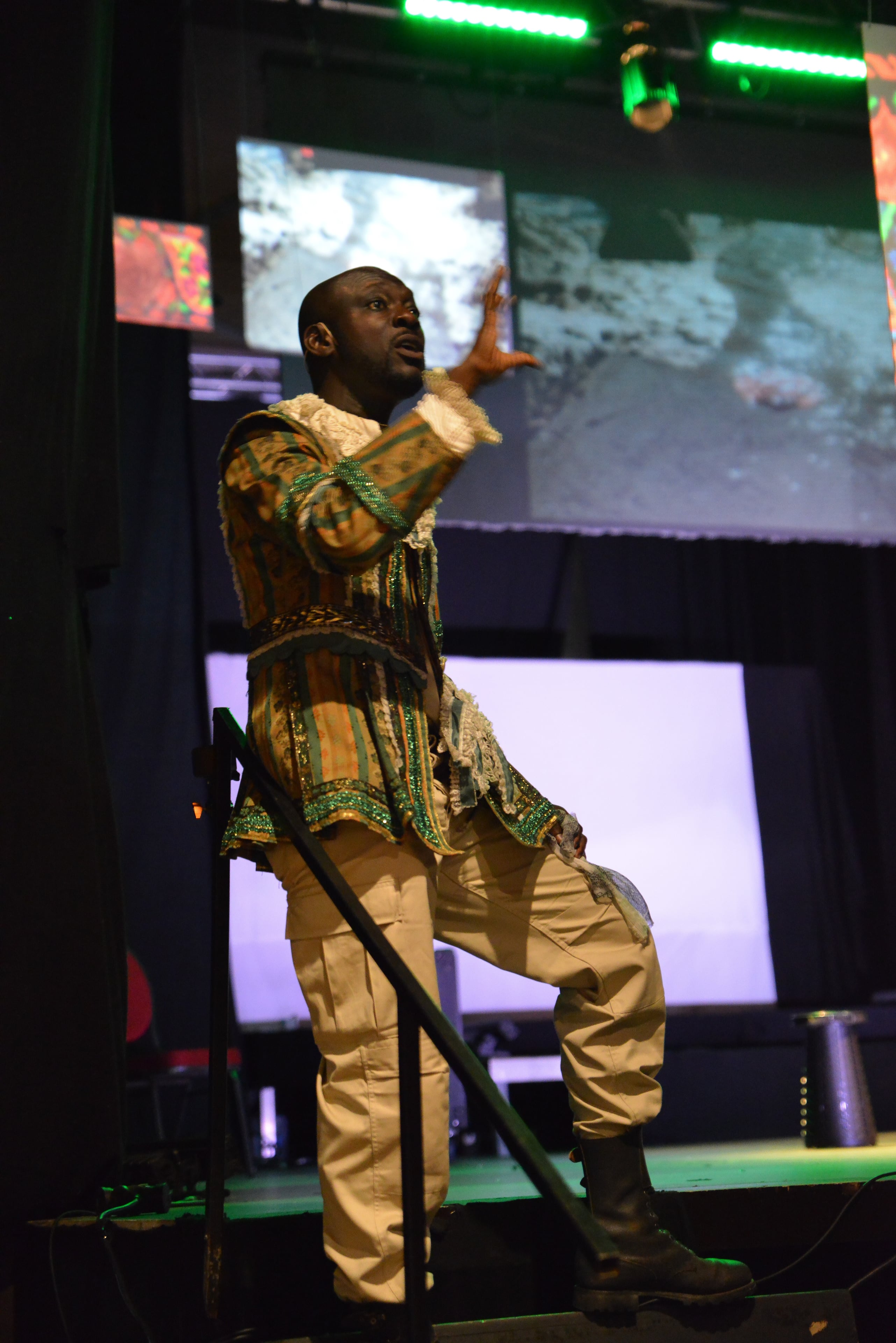 Noah Osarenren served as set designer, 3D world‑builder, and showrunner for SHAKES:WIR, creating the physical stage environment, crafting immersive digital spaces and animations, and coordinating the overall flow of the performance.